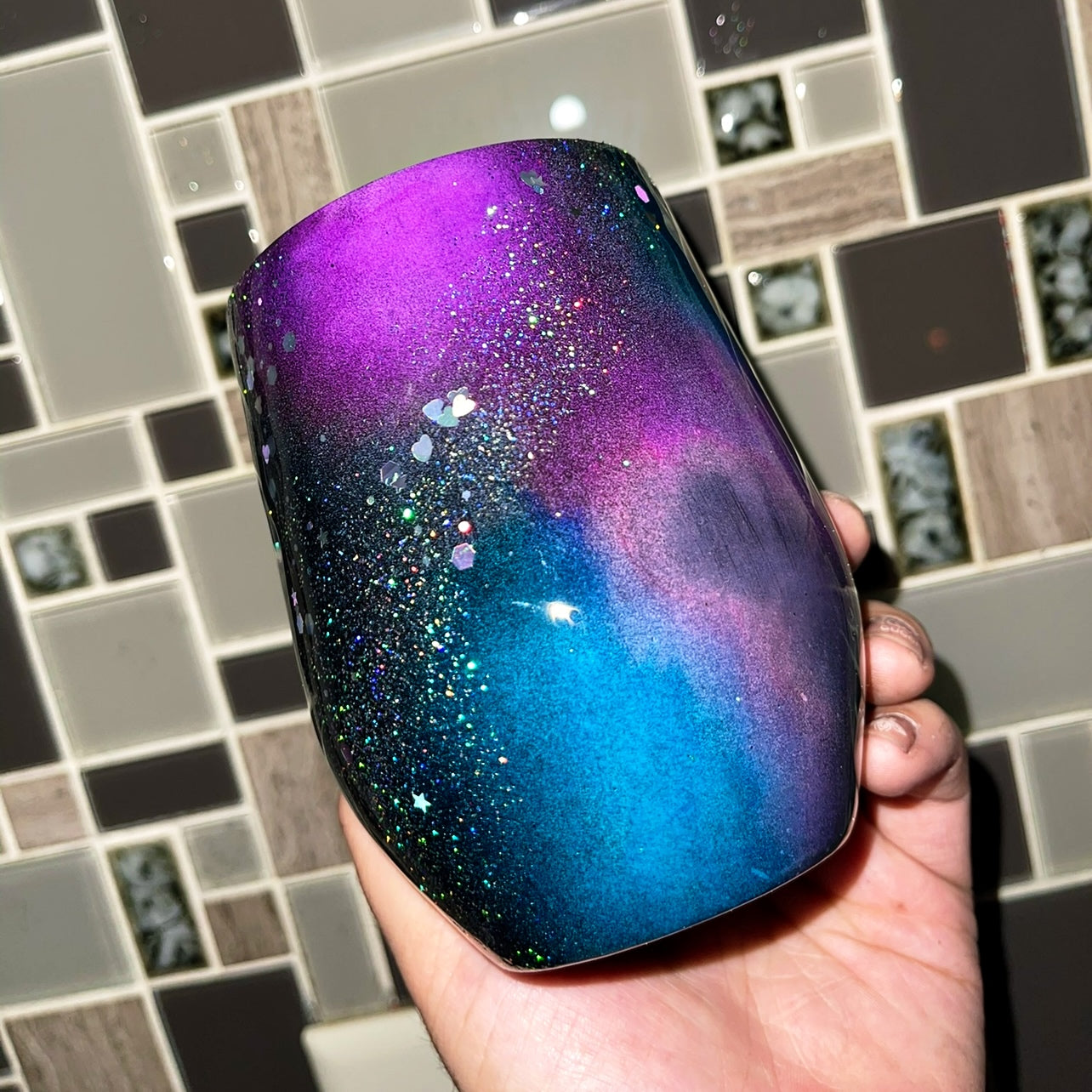 High grade Stainless steel tumblers. Vibrant alcohol inks added to this tumbler sprinkled with with this beautiful holographic glitter. All epoxied 3-5 times to give you a lifetime tumbler. Turn around time is approximately 2 weeks.